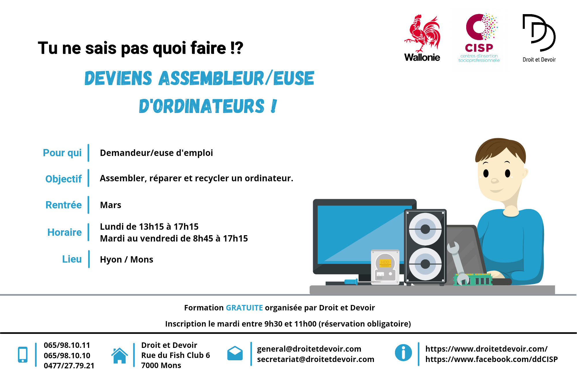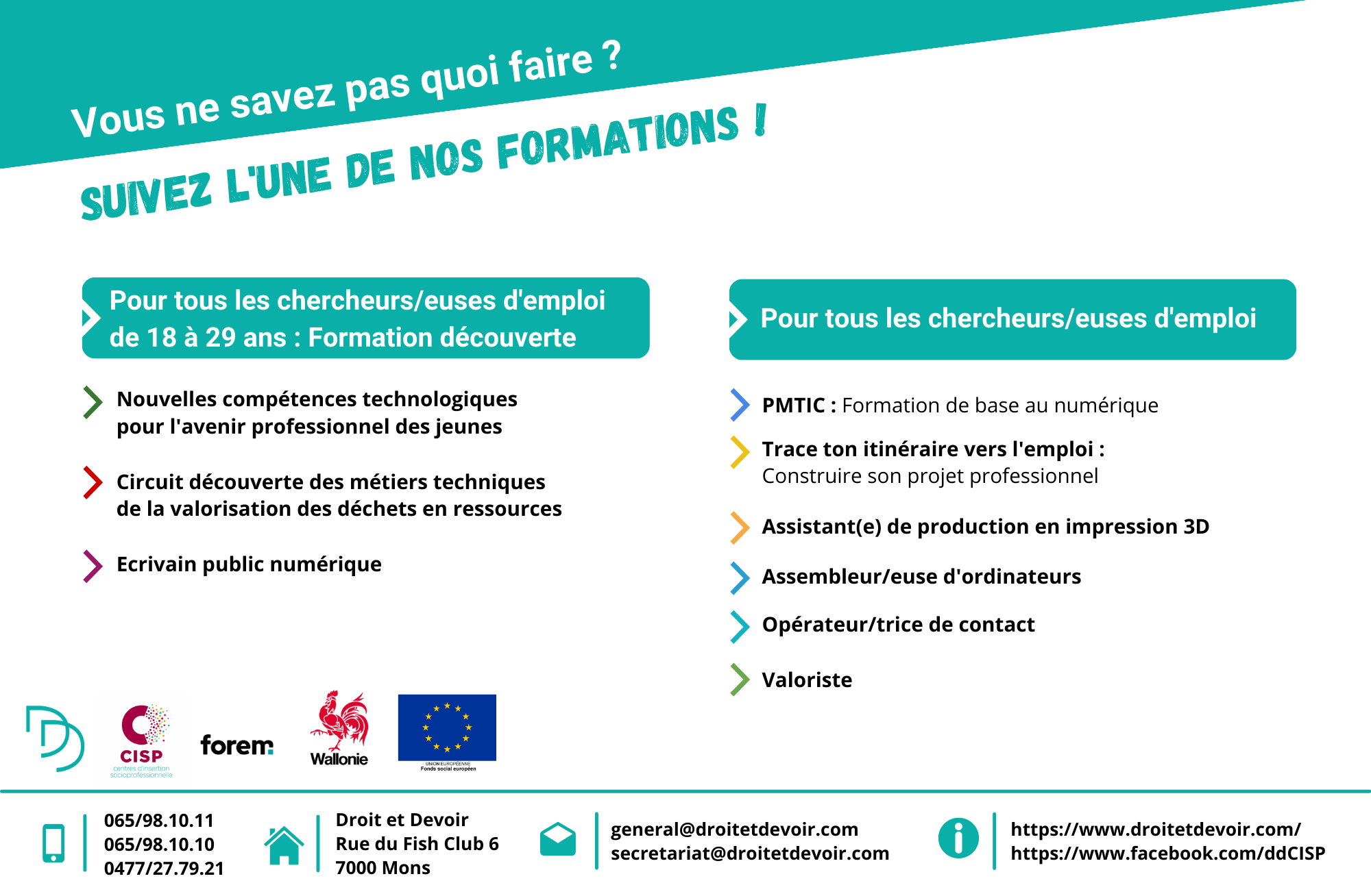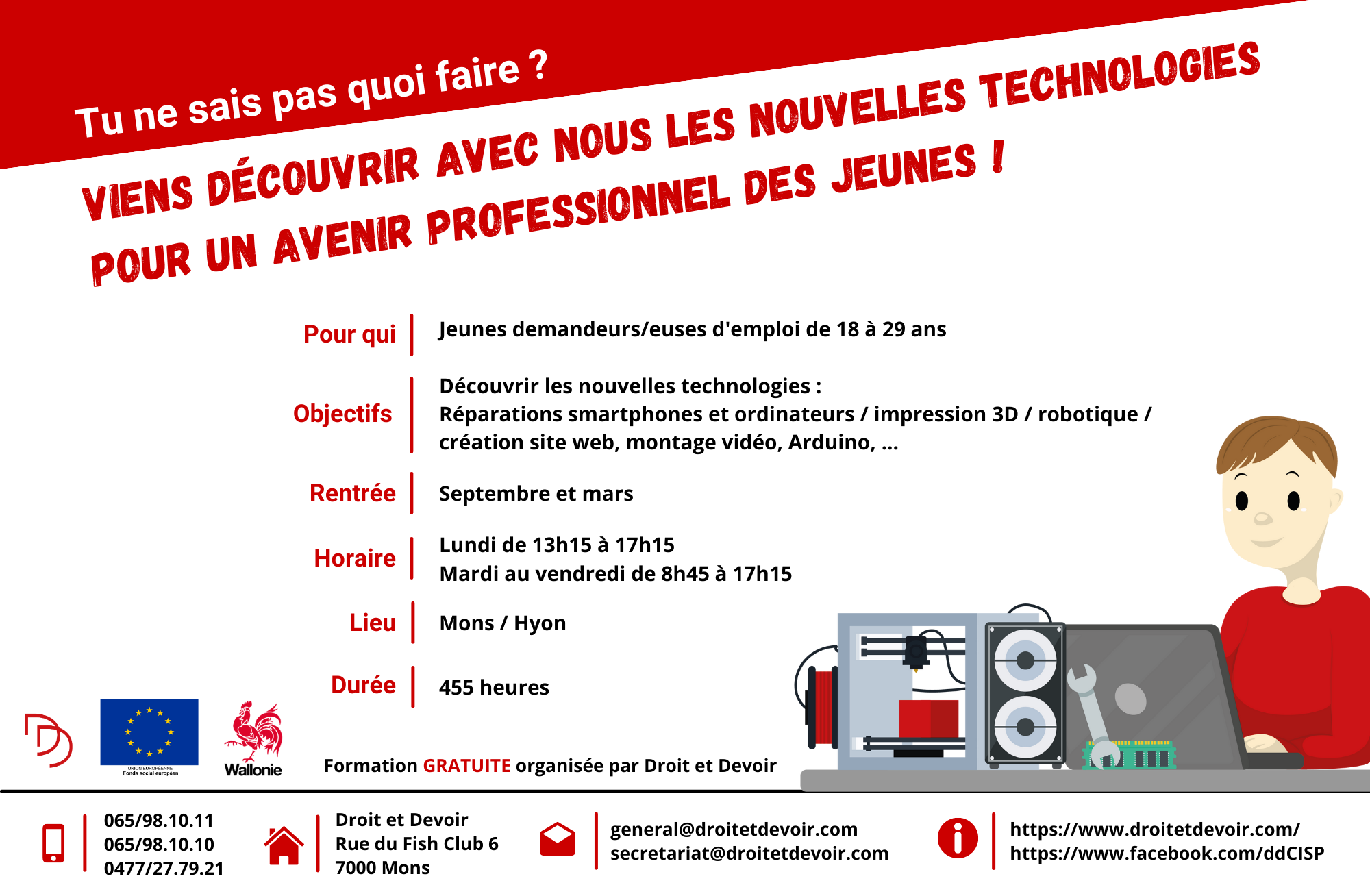 Formez-vous aux métiers de l'avenir : d'assembeur d'ordinateur à valoriste en passant par opérateur de Call Center et l'impression 3D, Droit & Devoir propose des formations professionnalisantes accesibles à toutes et tous et entièrement gratuites !